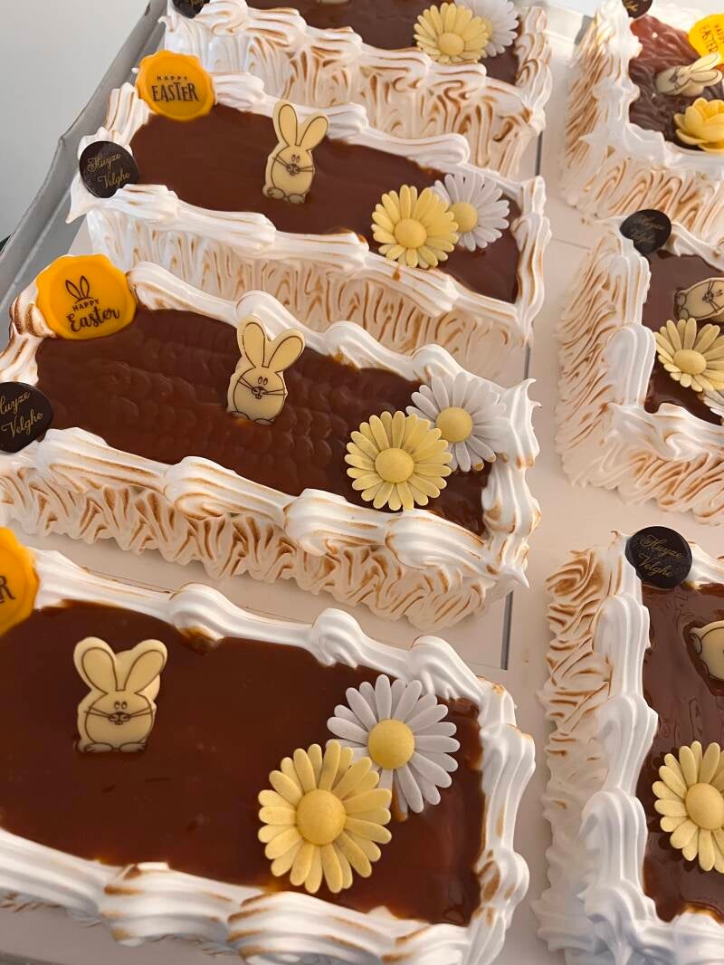 Vanille ijstaartje met gezouten caramel ijs. Dit paastaartje is afgewerken met meringue en een huisgemaakte gezouten caramel sausje.